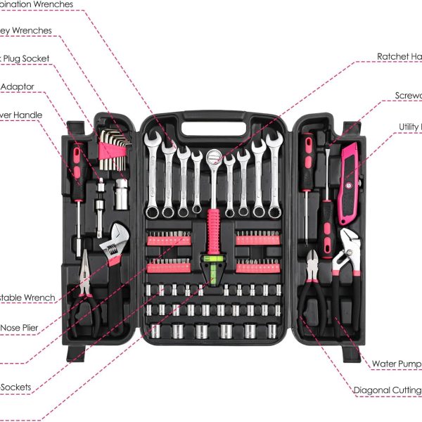 95 Piece Tool Set, Tool Kit, Mechanics Tool Set, Portable Toolbox with Adjustable Wrench Pliers Socket Bits, with Plastic Toolbox Storage Case, for House Apartment Garage (Pink)