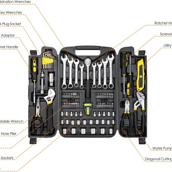 95 Piece Tool Set, Tool Kit, Mechanics Tool Set, Portable Toolbox with Adjustable Wrench Pliers Socket Bits, with Plastic Toolbox Storage Case, for House Apartment Garage (Yellow)