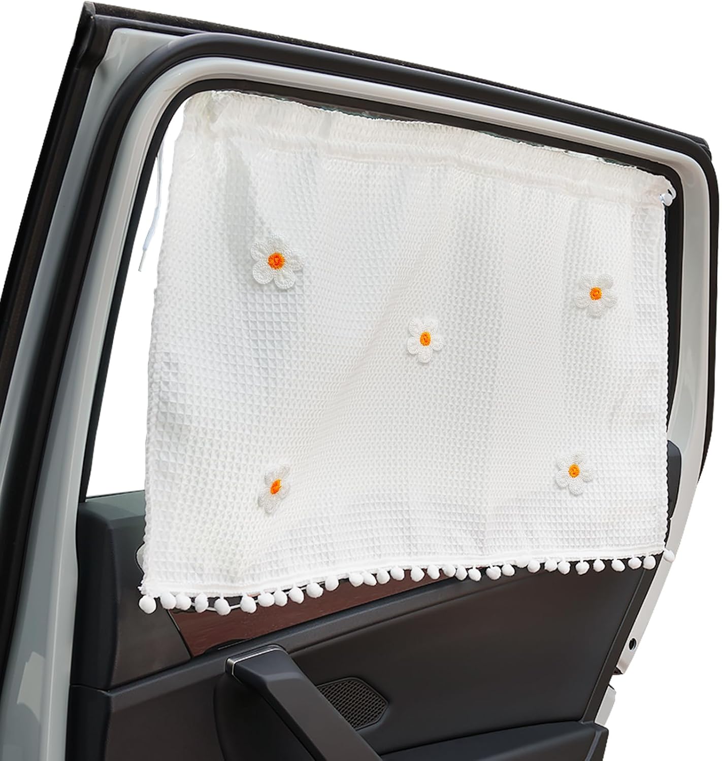 - [LARGER SIZE CAR SUNSHADE], Our side automotive window sunshades, the size is. It is the perfect car accessory for women’s interiors other than the car windshield sun shade. Must-have car window sun shades in the summer months. Can be used as car window shades for baby. The chic little daisy pattern adds a touch of fresh and lovely atmosphere to the product, making your baby car shade not only practical but also showing unique fashion taste. Adjustable size to fit more car models.