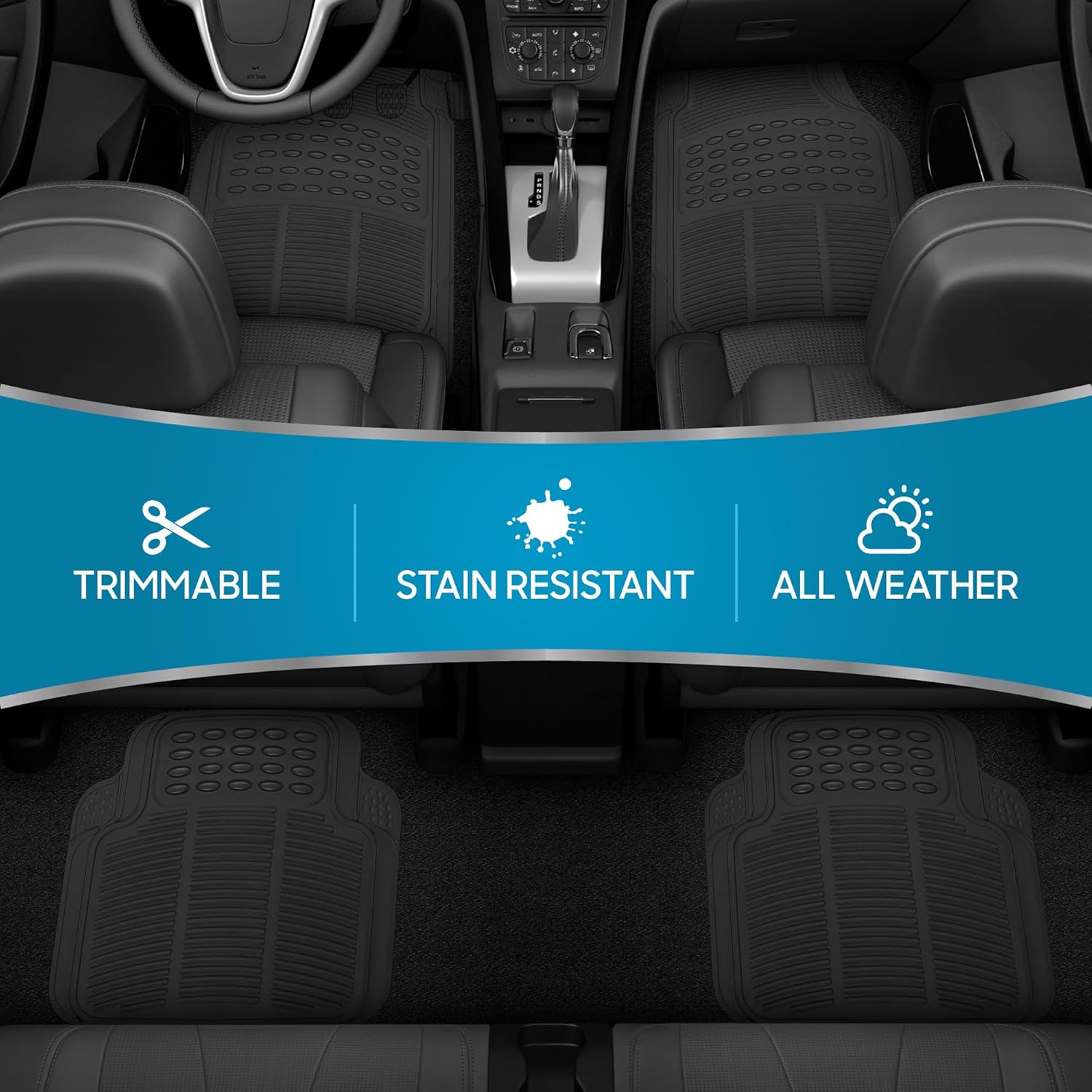 - Front mats: 28 x 18 inches, rear mats: 16.5 x 18 inches